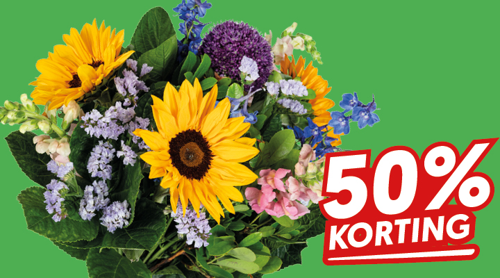 Wil jij een ander of jezelf blij maken met een mooie bos bloemen? Dan ben je bij ons aan het goede adres. Wij kopen elke dag zelf in op de bloemenveiling in Aalsmeer en bij vaste kwekers in Nederland. Van donderdag 7 t/m maandag 11 mei 2026 haal je een mooi boeket vier 't seizoen nu voor de helft van de prijs.